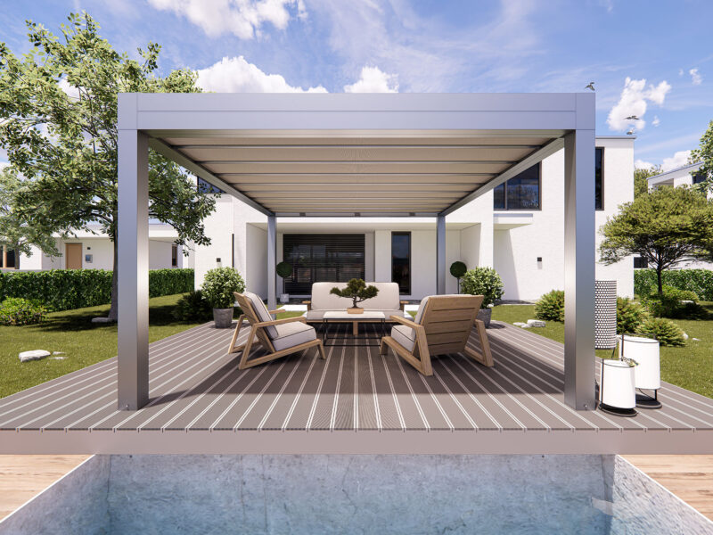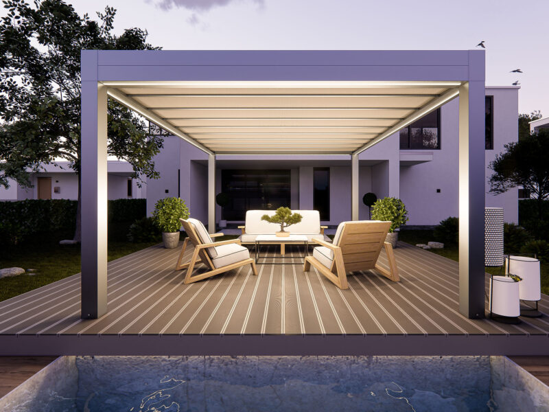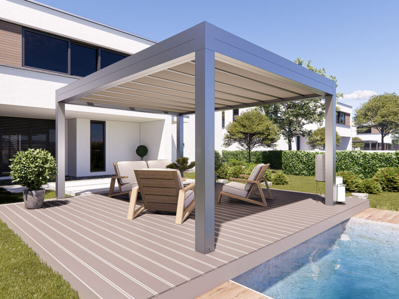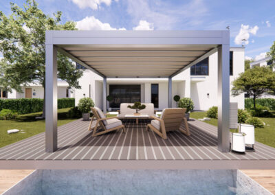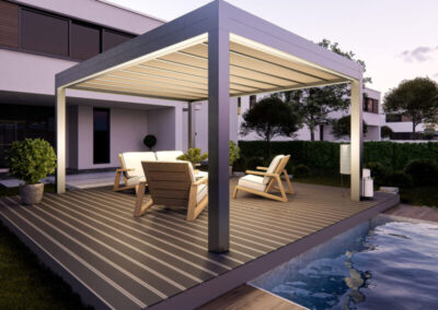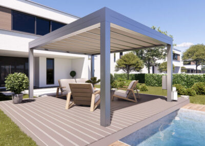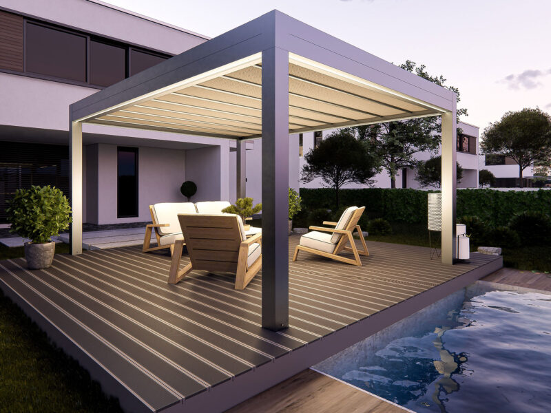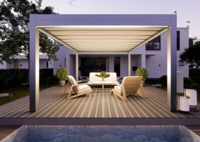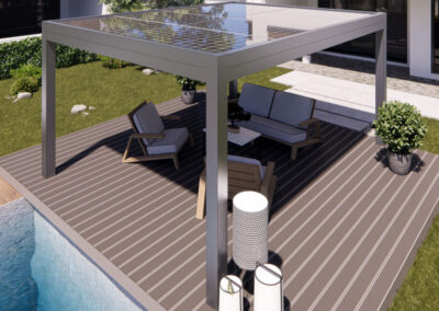 I teli microforati agiscono come scudo termico, ideali per ombreggiare e proteggere dalla grandine, garantendo la permeabilità della copertura. I teli sono ancorati alla struttura con un sistema di autotensionamento, in modo da offrire la massima resa estetica e funzionale.